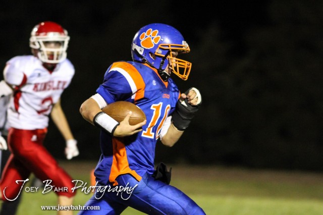 Otis-Bison Cougar Kade Urban (#10) runs for a touchdown during the Otis-Bison versus Kinsley High School 8-Man Football Game with Otis-Bison winning 104 to 70 which set a new state record for combined points in a game at Cougar Field at Otis-Bison High School in Otis, Kansas on September 26, 2014. (Photo: Joey Bahr, www.joeybahr.com)