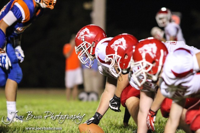 The Kinsley Coyote offensive line prepares to come out of their stances during the Otis-Bison versus Kinsley High School 8-Man Football Game with Otis-Bison winning 104 to 70 which set a new state record for combined points in a game at Cougar Field at Otis-Bison High School in Otis, Kansas on September 26, 2014. (Photo: Joey Bahr, www.joeybahr.com)