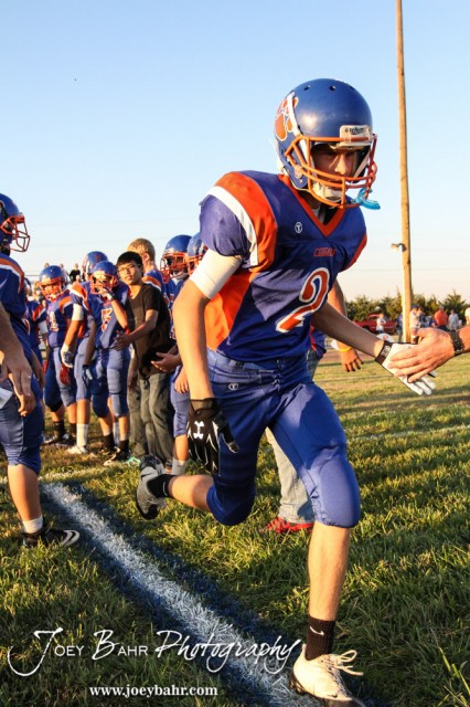 Otis-Bison Cougar Brandon Keller (#2) runs out for player introductions during the Otis-Bison versus Kinsley High School 8-Man Football Game with Otis-Bison winning 104 to 70 which set a new state record for combined points in a game at Cougar Field at Otis-Bison High School in Otis, Kansas on September 26, 2014. (Photo: Joey Bahr, www.joeybahr.com)