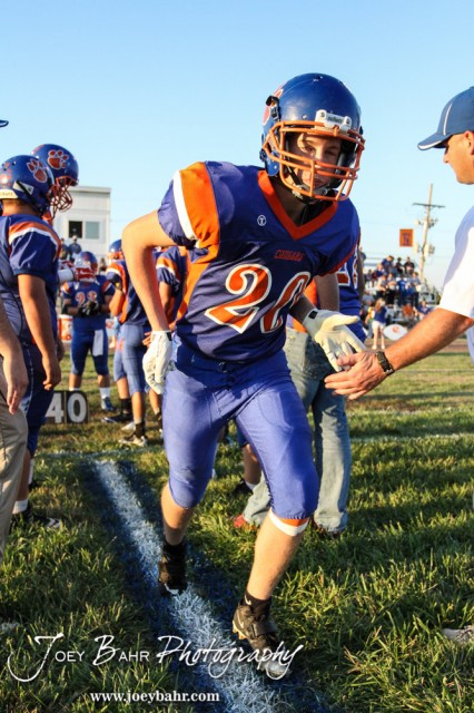 Otis-Bison Cougar Trenton Welsh (#20) runs out for player introductions during the Otis-Bison versus Kinsley High School 8-Man Football Game with Otis-Bison winning 104 to 70 which set a new state record for combined points in a game at Cougar Field at Otis-Bison High School in Otis, Kansas on September 26, 2014. (Photo: Joey Bahr, www.joeybahr.com)