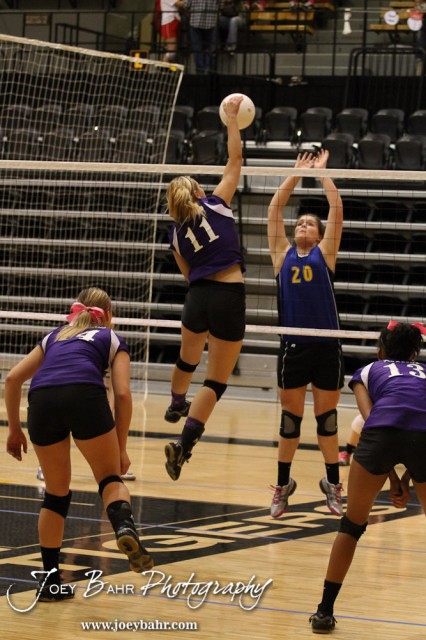 Wilson Lady Dragon Karlie Steinle (#11) hits the ball over the net during the Wilson versus Southern Coffey County KSHSAA Class 1A Division II State Volleyball Pool II match with Wilson winning 25-11, 25-8 in Hays, Kansas on October 26, 2012. (Photo: Joey Bahr, www.joeybahr.com)