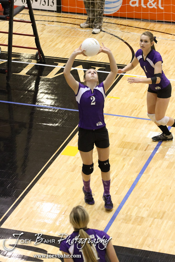 Wilson Lady Dragon McKenzie Thrasher (#2) sets the ball during the Wilson versus Southern Coffey County KSHSAA Class 1A Division II State Volleyball Pool II match with Wilson winning 25-11, 25-8 in Hays, Kansas on October 26, 2012. (Photo: Joey Bahr, www.joeybahr.com)