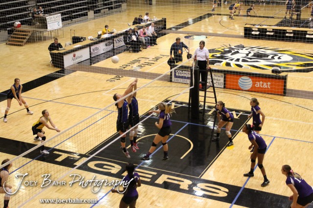 Wilson Lady Dragon Karlie Steinle (#11) hits the ball over the net during the Wilson versus Southern Coffey County KSHSAA Class 1A Division II State Volleyball Pool II match with Wilson winning 25-11, 25-8 in Hays, Kansas on October 26, 2012. (Photo: Joey Bahr, www.joeybahr.com)