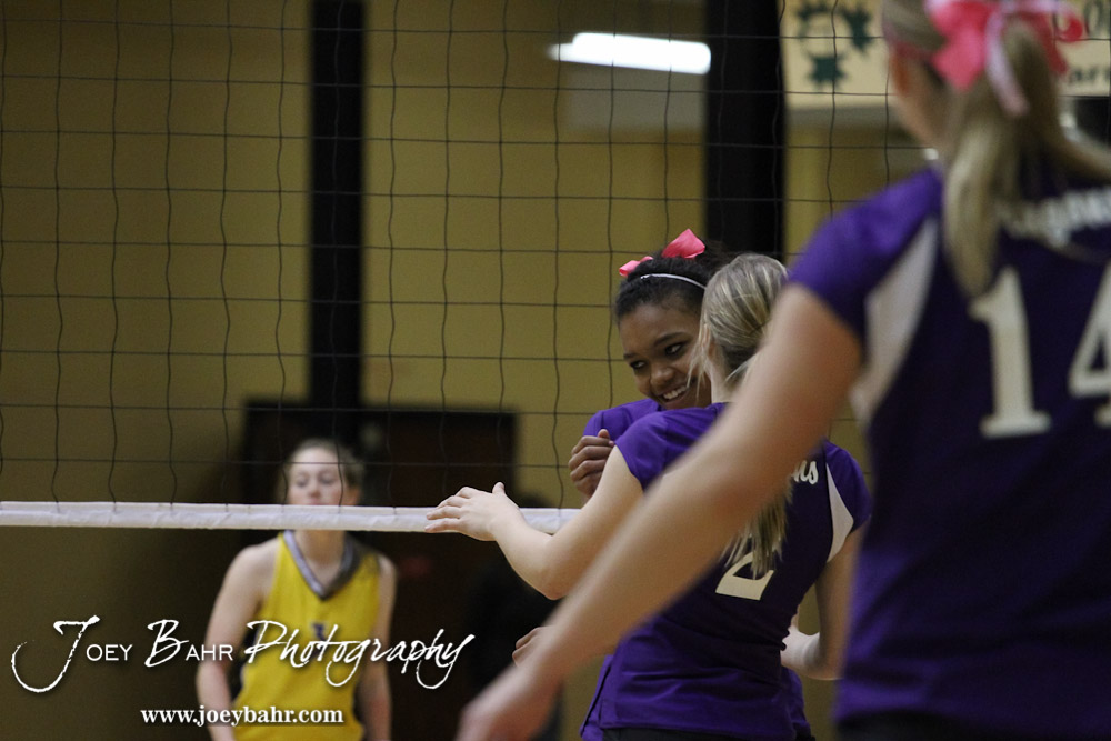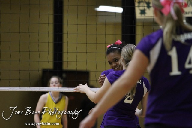 Wilson Lady Dragon McKenzie Thrasher (#2) congratulates Shania Steinike (#13) on scoring a point during the Wilson versus Southern Coffey County KSHSAA Class 1A Division II State Volleyball Pool II match with Wilson winning 25-11, 25-8 in Hays, Kansas on October 26, 2012. (Photo: Joey Bahr, www.joeybahr.com)