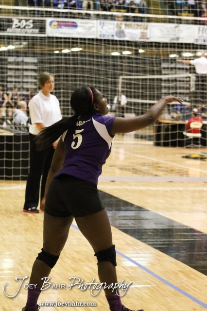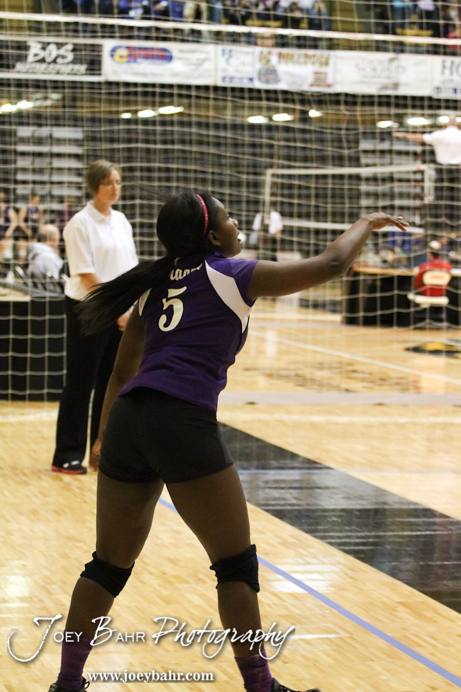 Wilson Lady Dragon Tanisha Steinike (#5) serves the ball during the Wilson versus Weskan KSHSAA Class 1A Division II State Volleyball Pool II match with Weskan winning 26-24, 25-12 in Hays, Kansas on October 26, 2012. (Photo: Joey Bahr, www.joeybahr.com)