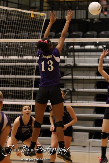 Wilson Lady Dragon Shania Steinike (#13) goes up to block the ball during the Wilson versus Weskan KSHSAA Class 1A Division II State Volleyball Pool II match with Weskan winning 26-24, 25-12 in Hays, Kansas on October 26, 2012. (Photo: Joey Bahr, www.joeybahr.com)