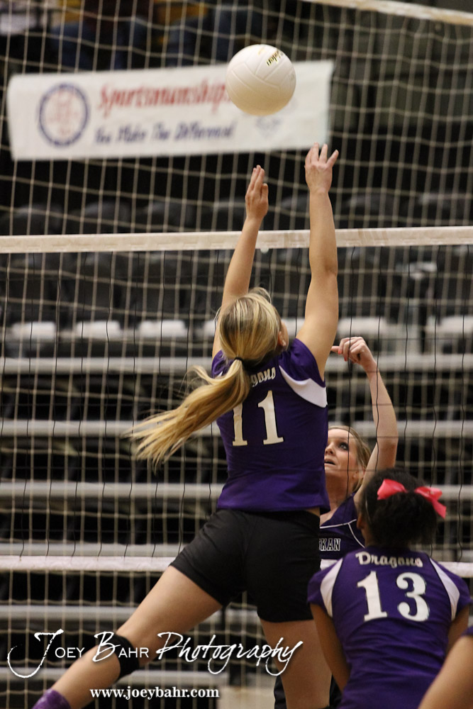 Wilson Lady Dragon Karlie Steinle (#11) sets a block during the Wilson versus Weskan KSHSAA Class 1A Division II State Volleyball Pool II match with Weskan winning 26-24, 25-12 in Hays, Kansas on October 26, 2012. (Photo: Joey Bahr, www.joeybahr.com)