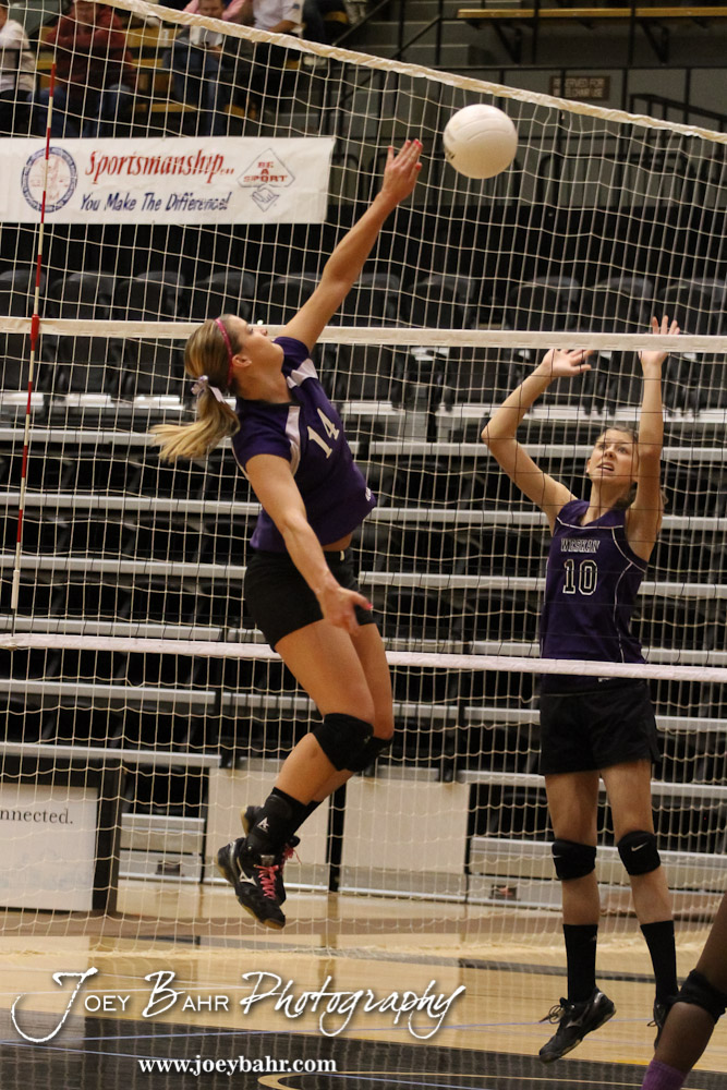 Wilson Lady Dragon Antjelica Pfannenstiel (#14) hits a shot over the net during the Wilson versus Weskan KSHSAA Class 1A Division II State Volleyball Pool II match with Weskan winning 26-24, 25-12 in Hays, Kansas on October 26, 2012. (Photo: Joey Bahr, www.joeybahr.com)