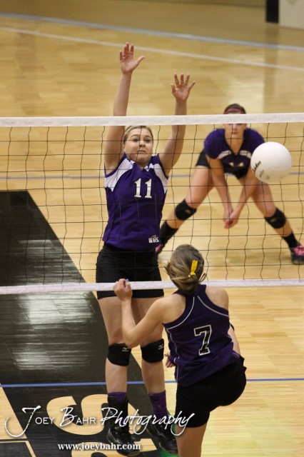 Wilson Lady Dragon Karlie Steinle (#11) goes to block a shot from Weskan Lady Coyote Robyn See (#7) during the Wilson versus Weskan KSHSAA Class 1A Division II State Volleyball Pool II match with Weskan winning 26-24, 25-12 in Hays, Kansas on October 26, 2012. (Photo: Joey Bahr, www.joeybahr.com)