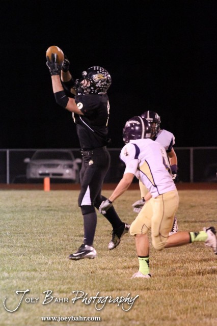 LaCrosse Leopard Kip Keeley (#2) reaches up for a pass during the Oakley at LaCrosse KSHSAA Class 2-1A Sectional Football Playoff game with LaCrosse winning 20-8 at LaCrosse High School in LaCrosse, Kansas on November 9, 2012. (Photo: Joey Bahr, www.joeybahr.com)