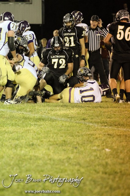 LaCrosse Leopard Matthew Wagner (#72) gets from from tackling Oakley Plainsmen Oscar Macias (#10) during the Oakley at LaCrosse KSHSAA Class 2-1A Sectional Football Playoff game with LaCrosse winning 20-8 at LaCrosse High School in LaCrosse, Kansas on November 9, 2012. (Photo: Joey Bahr, www.joeybahr.com)