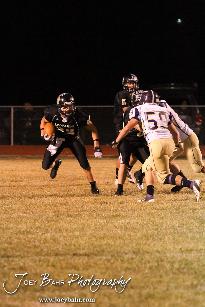 LaCrosse Leopard Levi Morss (#22) carries the ball during the Oakley at LaCrosse KSHSAA Class 2-1A Sectional Football Playoff game with LaCrosse winning 20-8 at LaCrosse High School in LaCrosse, Kansas on November 9, 2012. (Photo: Joey Bahr, www.joeybahr.com)
