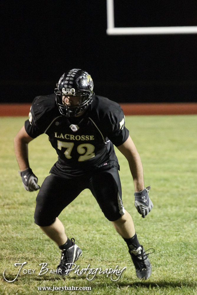 LaCrosse Leopard Matthew Wagner (#72) watches a play develop during the Oakley at LaCrosse KSHSAA Class 2-1A Sectional Football Playoff game with LaCrosse winning 20-8 at LaCrosse High School in LaCrosse, Kansas on November 9, 2012. (Photo: Joey Bahr, www.joeybahr.com)