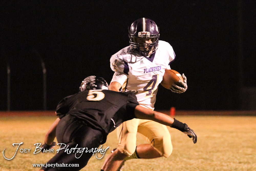LaCrosse Leopard Jack Garcia (#5) tries to tackle Oakley Plainsmen Ethan Plummer (#4) during the Oakley at LaCrosse KSHSAA Class 2-1A Sectional Football Playoff game with LaCrosse winning 20-8 at LaCrosse High School in LaCrosse, Kansas on November 9, 2012. (Photo: Joey Bahr, www.joeybahr.com)
