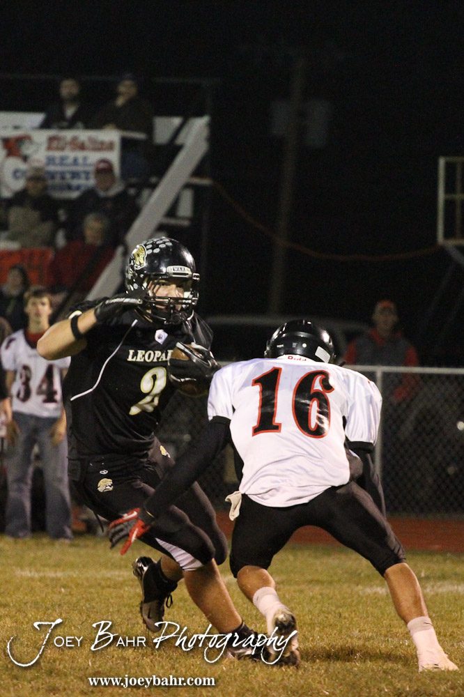 LaCrosse Leopard Kip Keeley (#2) changes directions to avoid the tackle of Ell-Saline Cardinal LuizAntonio Arceo (#16) during the Ell-Saline at LaCrosse KSHSAA Class 2-1A Football Playoff game with LaCrosse Winning 35-6 at LaCrosse High School in LaCrosse, Kansas on November 2, 2012. (Photo: Joey Bahr, www.joeybahr.com)