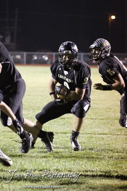 LaCrosse Leopard Kip Keeley (#2) runs towards a hole during the Ell-Saline at LaCrosse KSHSAA Class 2-1A Football Playoff game with LaCrosse Winning 35-6 at LaCrosse High School in LaCrosse, Kansas on November 2, 2012. (Photo: Joey Bahr, www.joeybahr.com)