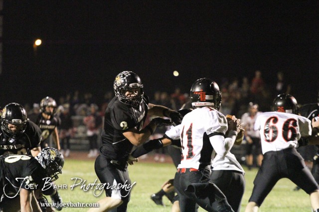 LaCrosse Leopard Kip Keeley (#2) runs past a blocker towards the Ell-Saline Cardinal Quaterback Garrett Walker (#11) during the Ell-Saline at LaCrosse KSHSAA Class 2-1A Football Playoff game with LaCrosse Winning 35-6 at LaCrosse High School in LaCrosse, Kansas on November 2, 2012. (Photo: Joey Bahr, www.joeybahr.com)