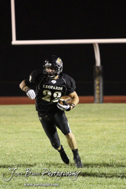 LaCrosse Leopard Levi Morss (#22) carries the ball during the Ell-Saline at LaCrosse KSHSAA Class 2-1A Football Playoff game with LaCrosse Winning 35-6 at LaCrosse High School in LaCrosse, Kansas on November 2, 2012. (Photo: Joey Bahr, www.joeybahr.com)