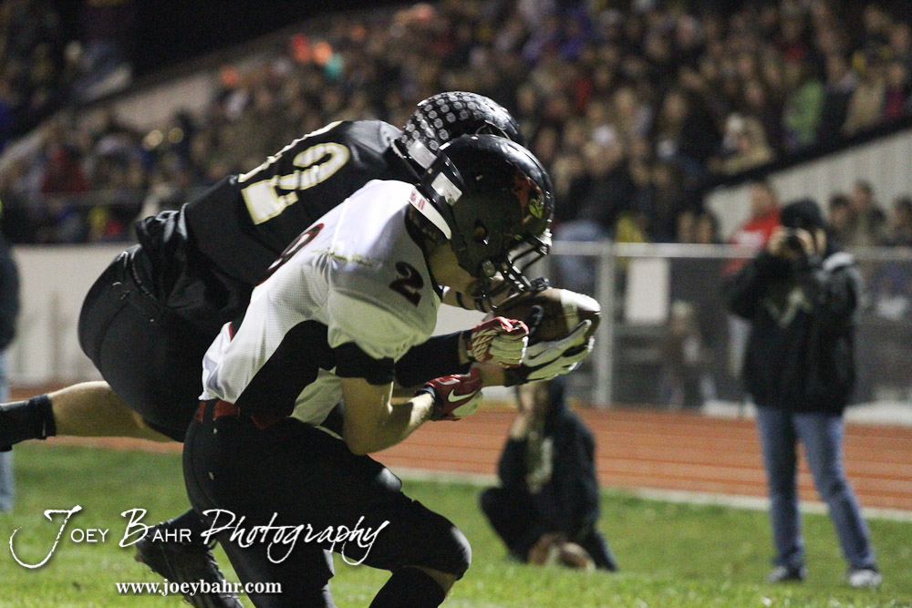 LaCrosse Leopard Levi Morss (#22) catches the ball while Ell-Saline Cardinal Keegan Hays (#2) defends during the Ell-Saline at LaCrosse KSHSAA Class 2-1A Football Playoff game with LaCrosse Winning 35-6 at LaCrosse High School in LaCrosse, Kansas on November 2, 2012. (Photo: Joey Bahr, www.joeybahr.com)