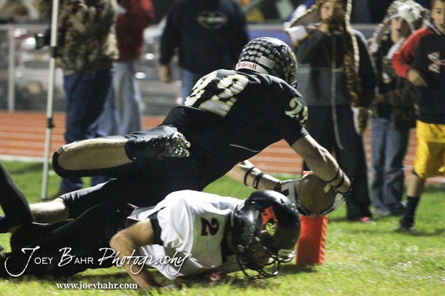 LaCrosse Leopard Levi Morss (#22) reaches for the pylon to score a touchdown over the tackle of Ell-Saline Cardinal Keegan Hays (#2) during the Ell-Saline at LaCrosse KSHSAA Class 2-1A Football Playoff game with LaCrosse Winning 35-6 at LaCrosse High School in LaCrosse, Kansas on November 2, 2012. (Photo: Joey Bahr, www.joeybahr.com)