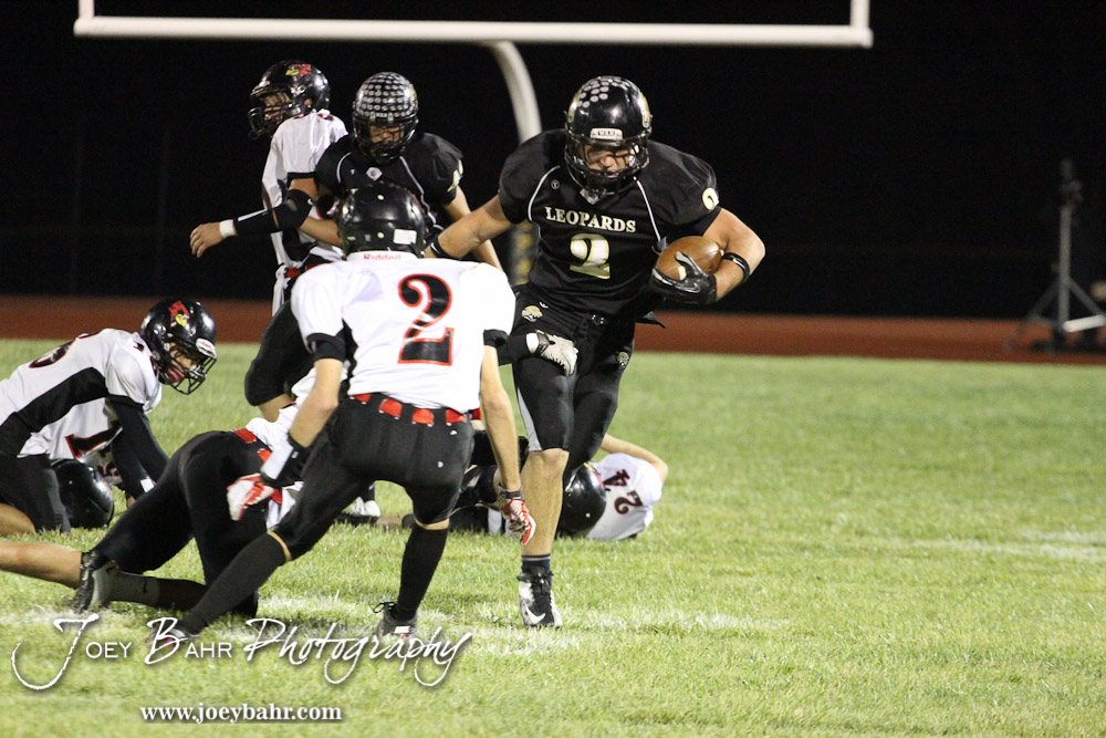 LaCrosse Leopard Kip Keeley (#2) carries the ball down the field while Ell-Saline Cardinal Keegan Hays (#2) prepares to tackle him during the Ell-Saline at LaCrosse KSHSAA Class 2-1A Football Playoff game with LaCrosse Winning 35-6 at LaCrosse High School in LaCrosse, Kansas on November 2, 2012. (Photo: Joey Bahr, www.joeybahr.com)