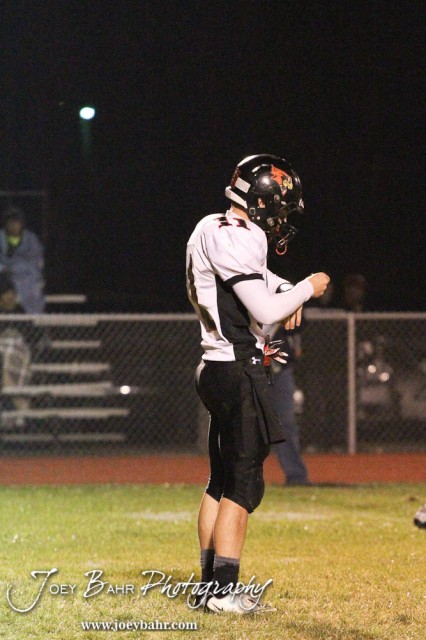 Ell-Saline Cardinal Quarterback Garrett Walker (#11) confirms the play called in during the Ell-Saline at LaCrosse KSHSAA Class 2-1A Football Playoff game with LaCrosse Winning 35-6 at LaCrosse High School in LaCrosse, Kansas on November 2, 2012. (Photo: Joey Bahr, www.joeybahr.com)