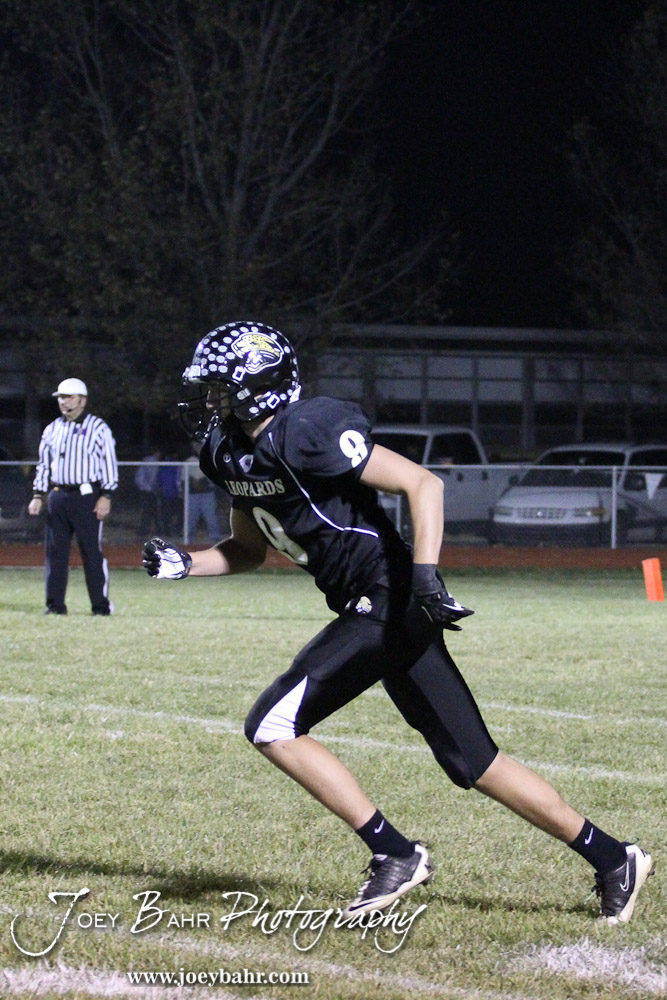 LaCrosse Leopard Taylor Yohe (#9) takes off on a pass route during the Ell-Saline at LaCrosse KSHSAA Class 2-1A Football Playoff game with LaCrosse Winning 35-6 at LaCrosse High School in LaCrosse, Kansas on November 2, 2012. (Photo: Joey Bahr, www.joeybahr.com)