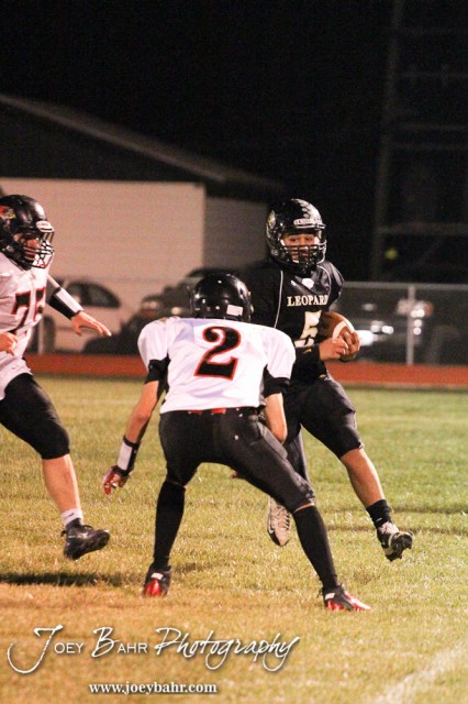 LaCrosse Leopard Jack Garcia (#5) runs towards the outside as Ell-Saline Cardinal Keegan Hays (#2) looks to tackle him during the Ell-Saline at LaCrosse KSHSAA Class 2-1A Football Playoff game with LaCrosse Winning 35-6 at LaCrosse High School in LaCrosse, Kansas on November 2, 2012. (Photo: Joey Bahr, www.joeybahr.com)
