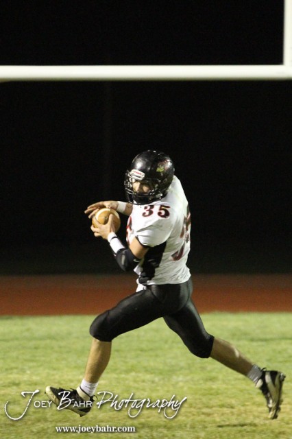 Ell-Saline Cardinal Justin Schmutz (#35) pulls the football towards his body and turns to run during the Ell-Saline at LaCrosse KSHSAA Class 2-1A Football Playoff game with LaCrosse Winning 35-6 at LaCrosse High School in LaCrosse, Kansas on November 2, 2012. (Photo: Joey Bahr, www.joeybahr.com)