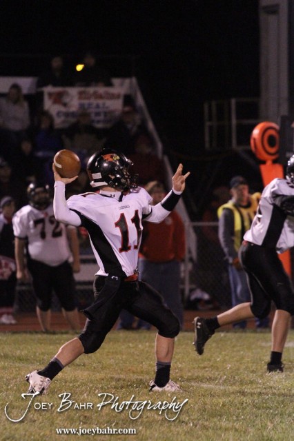 Ell-Saline Cardinal Garrett Walker (#11) winds up to pass the ball during the Ell-Saline at LaCrosse KSHSAA Class 2-1A Football Playoff game with LaCrosse Winning 35-6 at LaCrosse High School in LaCrosse, Kansas on November 2, 2012. (Photo: Joey Bahr, www.joeybahr.com)