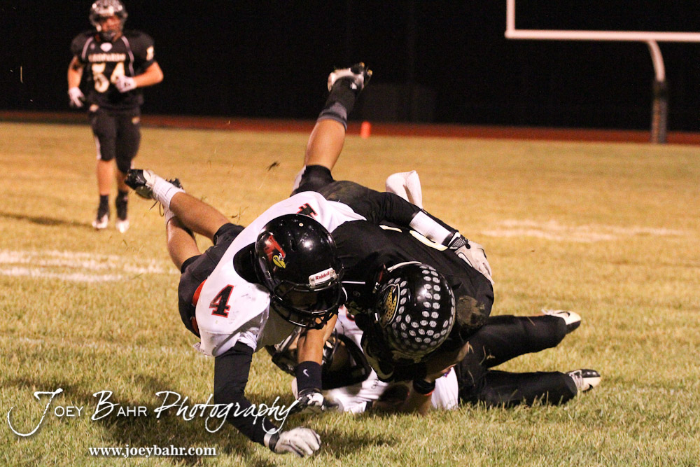 Ell-Saline Cardinal Luke Base (#4) tackles LaCrosse Leopard William Storie (#31) during the Ell-Saline at LaCrosse KSHSAA Class 2-1A Football Playoff game with LaCrosse Winning 35-6 at LaCrosse High School in LaCrosse, Kansas on November 2, 2012. (Photo: Joey Bahr, www.joeybahr.com)