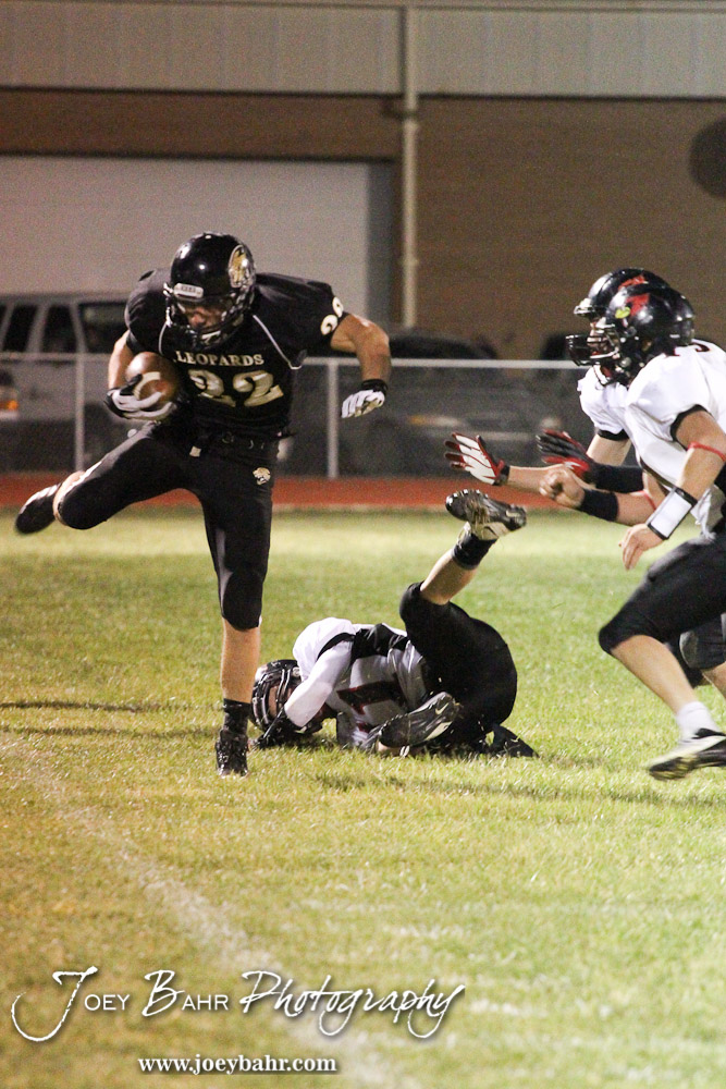 LaCrosse Leopard Levi Morss (#22) lands after hurdling Ell-Saline Cardinal Garrett Walker (#11) during the Ell-Saline at LaCrosse KSHSAA Class 2-1A Football Playoff game with LaCrosse Winning 35-6 at LaCrosse High School in LaCrosse, Kansas on November 2, 2012. (Photo: Joey Bahr, www.joeybahr.com)
