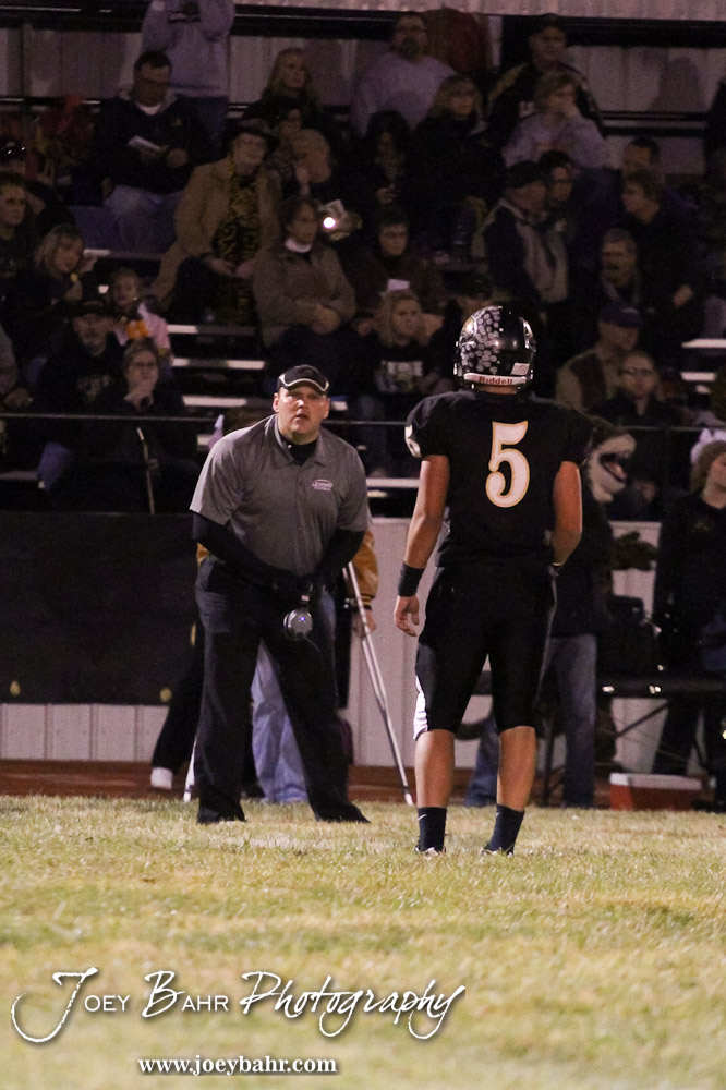 LaCrosse Leopard Head Coach Jon Webster talks to Jack Garcia (#5) during the Plainville versus LaCrosse KSHSAA Class 2-1A Regional Football Playoff game with LaCrosse winning 41 to 14 at Bill Schoenfelder Field in LaCrosse, Kansas on November 8, 2013. (Photo: Joey Bahr, www.joeybahr.com)