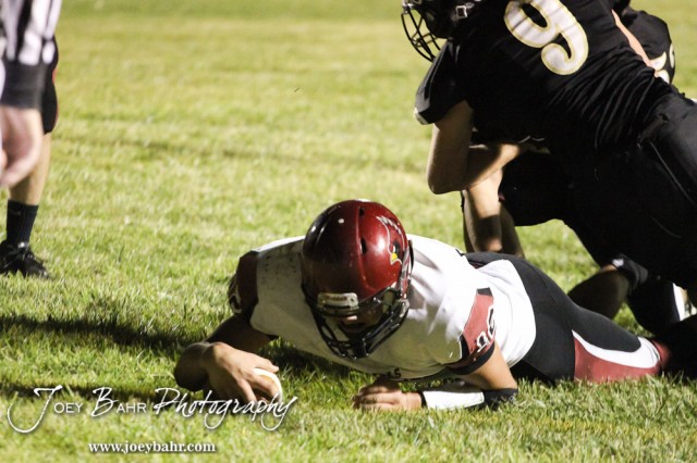Plainville Cardinal Hadley Gillum (#12) stretches out for a touchdown during the Plainville versus LaCrosse KSHSAA Class 2-1A Regional Football Playoff game with LaCrosse winning 41 to 14 at Bill Schoenfelder Field in LaCrosse, Kansas on November 8, 2013. (Photo: Joey Bahr, www.joeybahr.com)