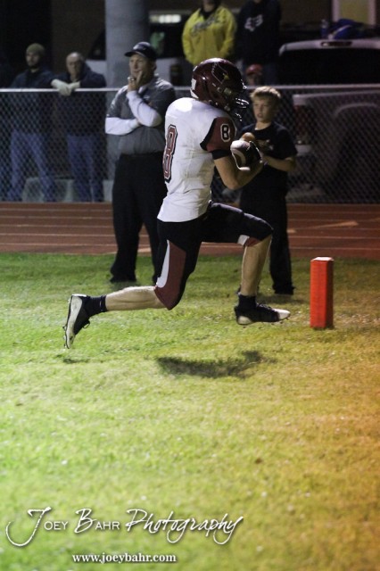 Plainville Cardinal Trevor Desaire (#8) runs in for the two point conversion during the Plainville versus LaCrosse KSHSAA Class 2-1A Regional Football Playoff game with LaCrosse winning 41 to 14 at Bill Schoenfelder Field in LaCrosse, Kansas on November 8, 2013. (Photo: Joey Bahr, www.joeybahr.com)