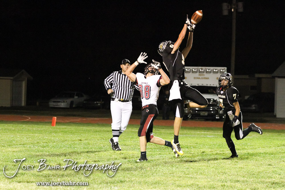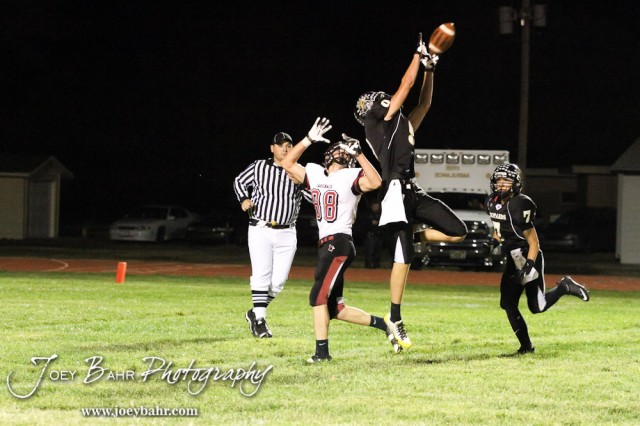 LaCrosse Leopard Taylor Yohe (#9) jumps to intercept a pass during the Plainville versus LaCrosse KSHSAA Class 2-1A Regional Football Playoff game with LaCrosse winning 41 to 14 at Bill Schoenfelder Field in LaCrosse, Kansas on November 8, 2013. (Photo: Joey Bahr, www.joeybahr.com)