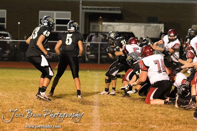 The Plainville Cardinal Defense stuffs LaCrosse Leopard Lucas Moeder (#21) on a two point conversion attempt during the Plainville versus LaCrosse KSHSAA Class 2-1A Regional Football Playoff game with LaCrosse winning 41 to 14 at Bill Schoenfelder Field in LaCrosse, Kansas on November 8, 2013. (Photo: Joey Bahr, www.joeybahr.com)