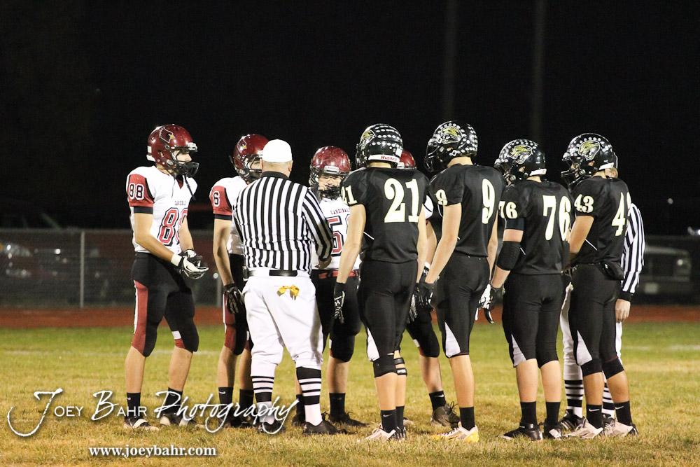 The captains for the LaCrosse Leopards and Plainville Cardinals meet at the center of the field for the coin toss during the Plainville versus LaCrosse KSHSAA Class 2-1A Regional Football Playoff game with LaCrosse winning 41 to 14 at Bill Schoenfelder Field in LaCrosse, Kansas on November 8, 2013. (Photo: Joey Bahr, www.joeybahr.com)