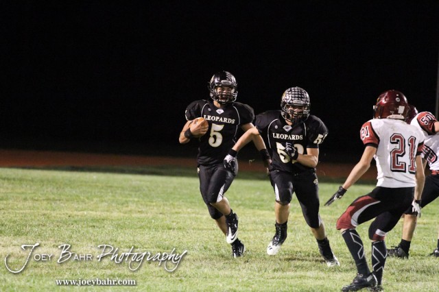 LaCrosse Leopard Kody Burns (#52) lead blocks for Jack Garcia (#5) during the Plainville versus LaCrosse KSHSAA Class 2-1A Regional Football Playoff game with LaCrosse winning 41 to 14 at Bill Schoenfelder Field in LaCrosse, Kansas on November 8, 2013. (Photo: Joey Bahr, www.joeybahr.com)