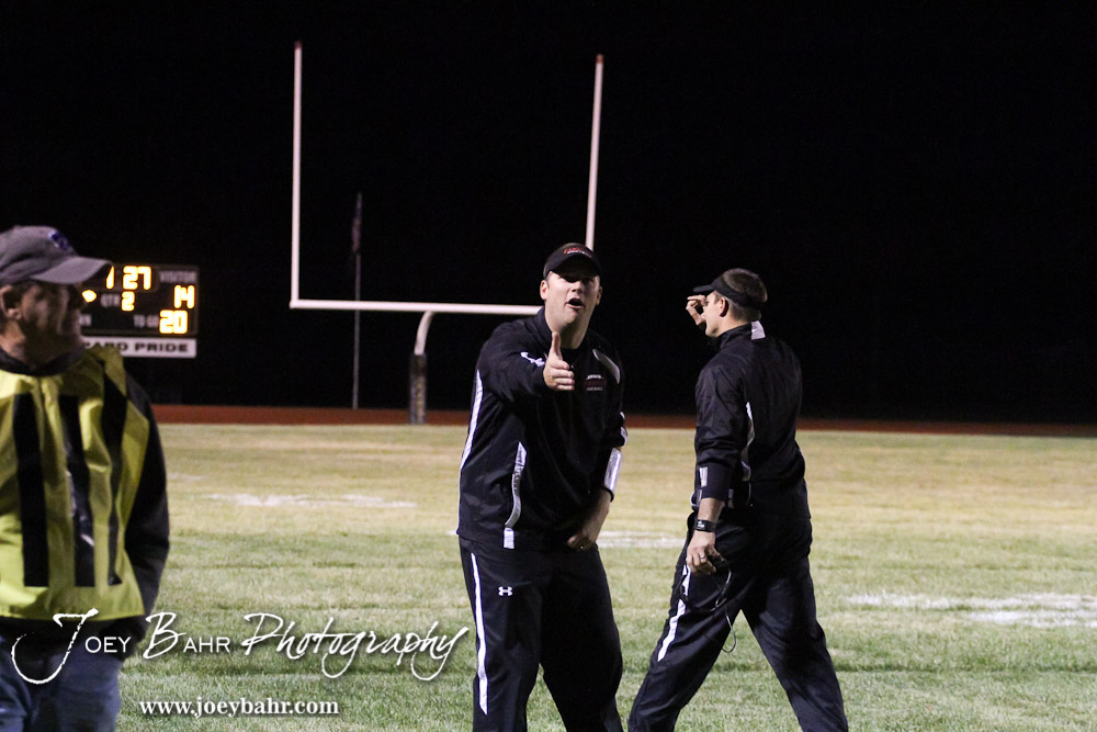 Plainville Cardinal Head Coach Joe Simon discusses a ruling with a referee during the Plainville versus LaCrosse KSHSAA Class 2-1A Regional Football Playoff game with LaCrosse winning 41 to 14 at Bill Schoenfelder Field in LaCrosse, Kansas on November 8, 2013. (Photo: Joey Bahr, www.joeybahr.com)