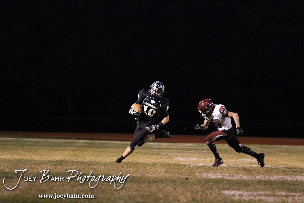 LaCrosse Leopard Andrew Jay (#10) runs with the ball during the Plainville versus LaCrosse KSHSAA Class 2-1A Regional Football Playoff game with LaCrosse winning 41 to 14 at Bill Schoenfelder Field in LaCrosse, Kansas on November 8, 2013. (Photo: Joey Bahr, www.joeybahr.com)