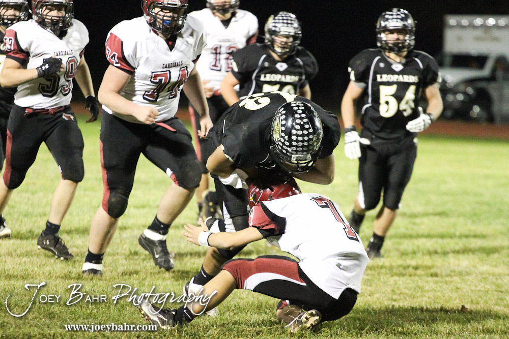 LaCrosse Leopard Marshall Jay (#43) bowls over Plainville Cardinal Ryan Buresh (#7) during the Plainville versus LaCrosse KSHSAA Class 2-1A Regional Football Playoff game with LaCrosse winning 41 to 14 at Bill Schoenfelder Field in LaCrosse, Kansas on November 8, 2013. (Photo: Joey Bahr, www.joeybahr.com)