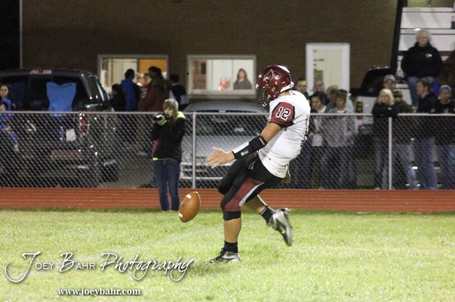 Plainville Cardinal Hadley Gillum (#12) punts the ball during the Plainville versus LaCrosse KSHSAA Class 2-1A Regional Football Playoff game with LaCrosse winning 41 to 14 at Bill Schoenfelder Field in LaCrosse, Kansas on November 8, 2013. (Photo: Joey Bahr, www.joeybahr.com)