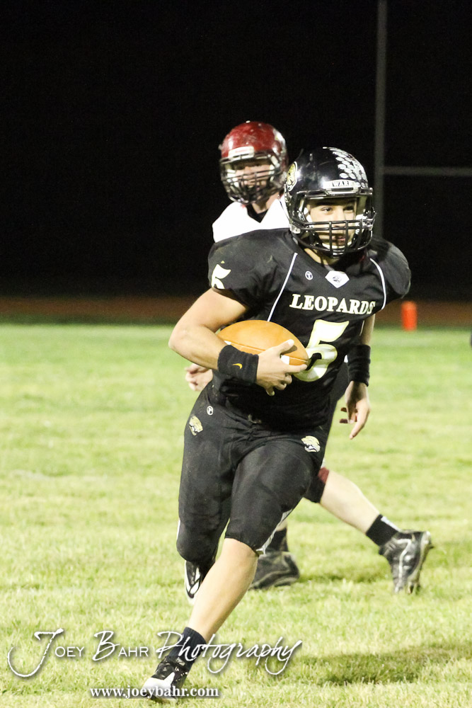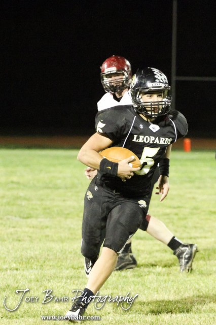 LaCrosse Leopard Jack Garcia (#5) runs with the ball during the Plainville versus LaCrosse KSHSAA Class 2-1A Regional Football Playoff game with LaCrosse winning 41 to 14 at Bill Schoenfelder Field in LaCrosse, Kansas on November 8, 2013. (Photo: Joey Bahr, www.joeybahr.com)