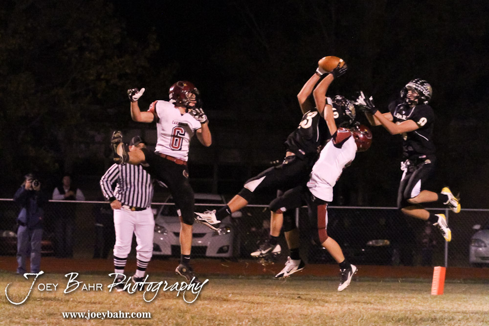 LaCrosse Leopard Marshall Jay (#43) goes up to catch a pass during the Plainville versus LaCrosse KSHSAA Class 2-1A Regional Football Playoff game with LaCrosse winning 41 to 14 at Bill Schoenfelder Field in LaCrosse, Kansas on November 8, 2013. (Photo: Joey Bahr, www.joeybahr.com)