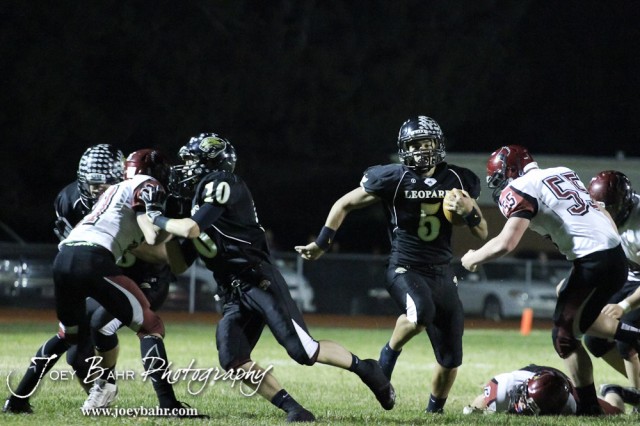 LaCrosse Leopard Jack Garcia (#5) finds a hole during the Plainville versus LaCrosse KSHSAA Class 2-1A Regional Football Playoff game with LaCrosse winning 41 to 14 at Bill Schoenfelder Field in LaCrosse, Kansas on November 8, 2013. (Photo: Joey Bahr, www.joeybahr.com)