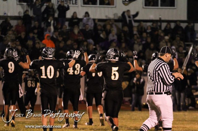 The LaCrosse Leopards hold up four fingers to show the beginning of the Fourth Quarter during the Plainville versus LaCrosse KSHSAA Class 2-1A Regional Football Playoff game with LaCrosse winning 41 to 14 at Bill Schoenfelder Field in LaCrosse, Kansas on November 8, 2013. (Photo: Joey Bahr, www.joeybahr.com)
