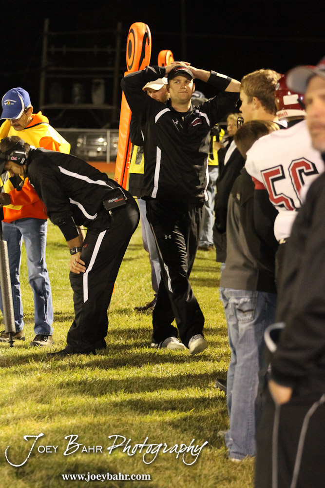 Frustration shows on the faces of the Plainville Cardinal coaching staff during the Plainville versus LaCrosse KSHSAA Class 2-1A Regional Football Playoff game with LaCrosse winning 41 to 14 at Bill Schoenfelder Field in LaCrosse, Kansas on November 8, 2013. (Photo: Joey Bahr, www.joeybahr.com)