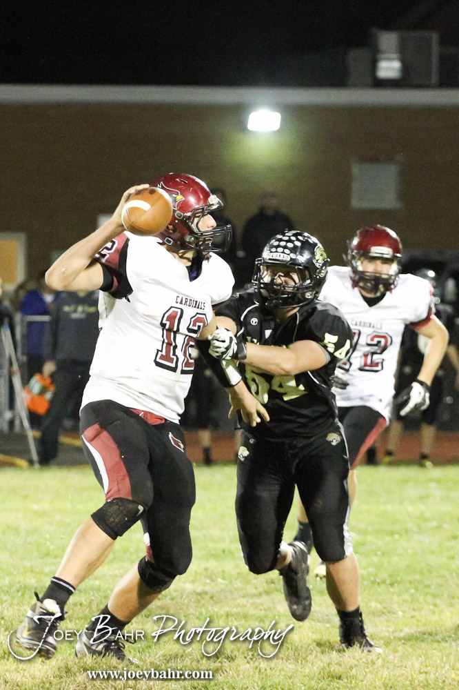 LaCrosse Leopard Cody Lee (#54) tries to sack Plainville Cardinal Hadley Gillum (#12) during the Plainville versus LaCrosse KSHSAA Class 2-1A Regional Football Playoff game with LaCrosse winning 41 to 14 at Bill Schoenfelder Field in LaCrosse, Kansas on November 8, 2013. (Photo: Joey Bahr, www.joeybahr.com)