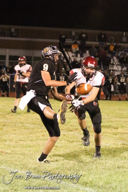LaCrosse Leopard Taylor Yohe (#9) catches a pass during the Plainville versus LaCrosse KSHSAA Class 2-1A Regional Football Playoff game with LaCrosse winning 41 to 14 at Bill Schoenfelder Field in LaCrosse, Kansas on November 8, 2013. (Photo: Joey Bahr, www.joeybahr.com)